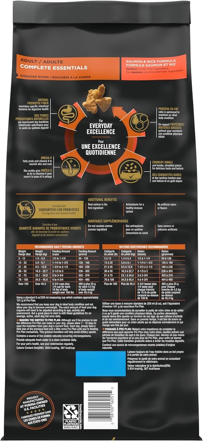 Ensure nutrition and taste when you make this Purina Pro Plan Brand Dog Food Shredded Blend Salmon & Rice Formula adult dry dog food part of your dog's mealtime regimen. This super-premium Purina Pro Plan dog food, with real salmon as the first ingredient, has an irresistible flavor, and the blend of hard dog food kibble and tender shredded pieces gives him texture to sink his teeth into. Vitamin A and linoleic acid, an omega-6 fatty acid, nourish skin and a shiny coat, and this antioxidant-rich formula provides immune system support. Natural prebiotic fiber sourced from wheat bran nourishes specific intestinal bacteria for digestive health, while guaranteed live probiotics promote digestive and immune health. Featuring 100 percent complete and balanced nutrition for adult dogs, our Purina Pro Plan COMPLETE ESSENTIALS adult dog food formula for healthy skin and coat combines the taste dogs can't resist with the wholesome goodness you demand in a high-protein dog food.